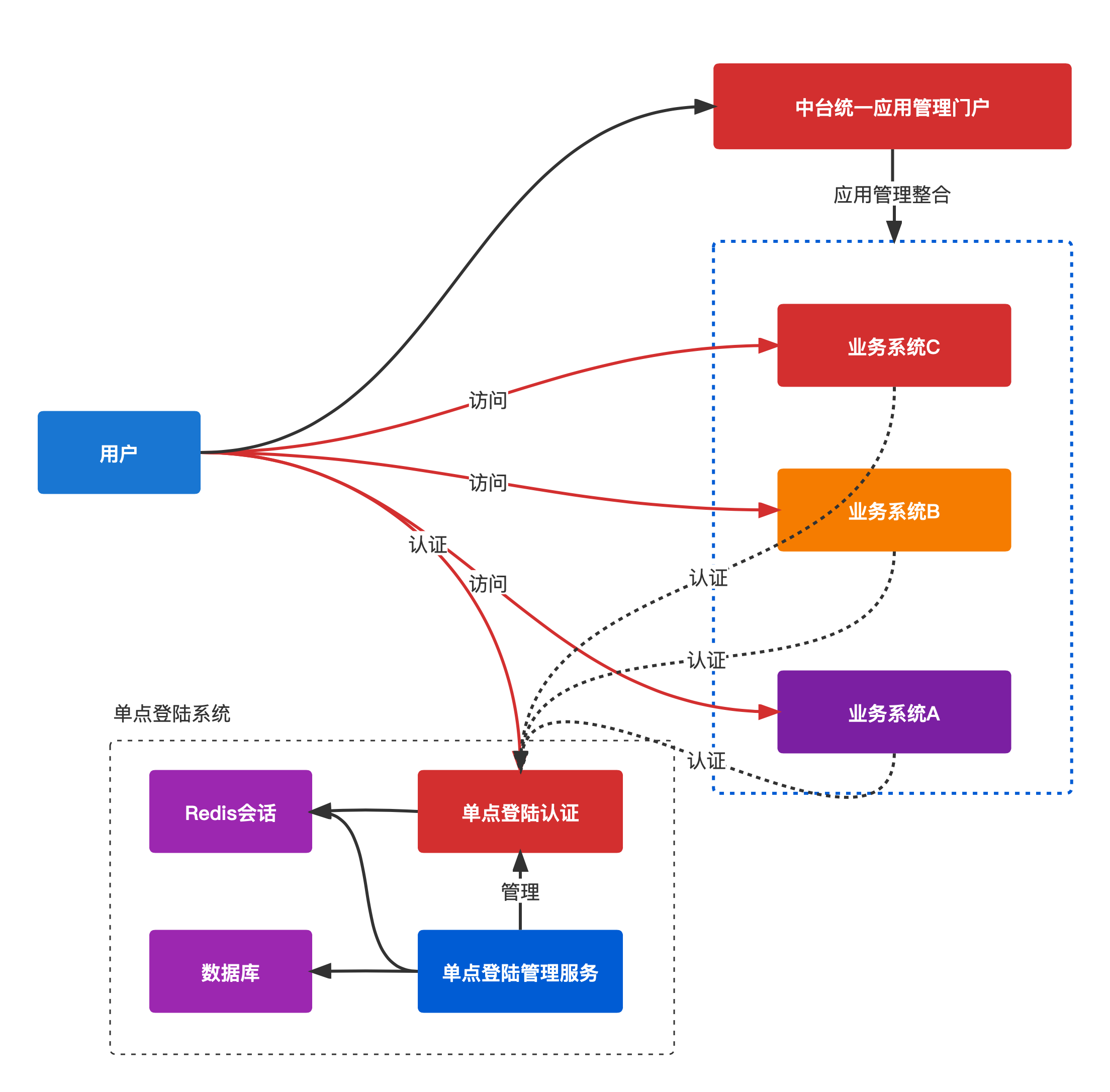 單點(diǎn)登陸解決方案架構(gòu),集成應(yīng)用管理門(mén)戶,集成多個(gè)業(yè)務(wù)系統(tǒng)管理,架構(gòu)如下: